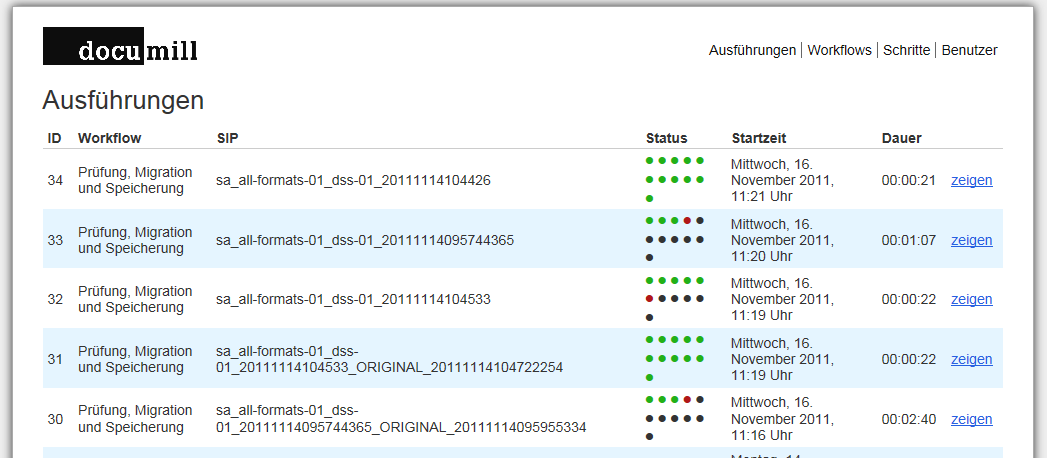 - Ausführungen: Hier wird zentral angezeigt, welche SIP durch den automatisierten Workflow bereits verarbeitet und ins digitale Archiv abgeliefert wurden, respektive welche Verarbeitung gerade im Gang ist. Es wird auch angezeigt, ob der Ingest-Workflow erfolgreich durchlaufen wurde oder ob Fehler aufgetreten sind, die manuelle Eingriffe nötig machen.