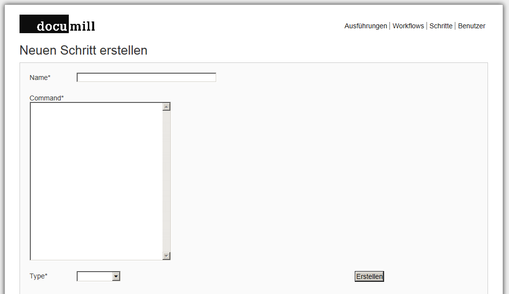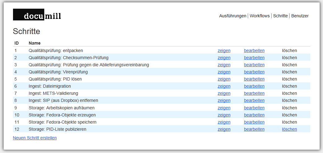 Der Menupunkt „Schritte“ zeigt sämtliche verfügbaren Workflowschritte an, die Documill hinterlegt sind und aus denen Ingest-Workflows zusammengestellt werden können.