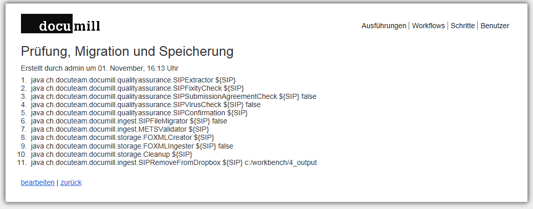 Unter „Bearbeiten“ können bestehende Workflows editiert und angepasst werden. Ein Workflow ist immer ein linearer Durchgang, das SIP wird gewissermassen in eine Pipeline hineingeschickt, in welcher ein Schritt nach dem anderen abgearbeitet wird.