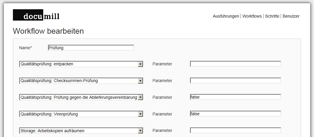 - Schritte: Einbindung und Konfiguration von Softwarekomponenten und Diensten, die gekapselt als einzelne Verarbeitungsschritte in einem Ingest-Workflow verwendet werden können (Menupunkt nur sichtbar, wenn mit Administratorrechten angemeldet).