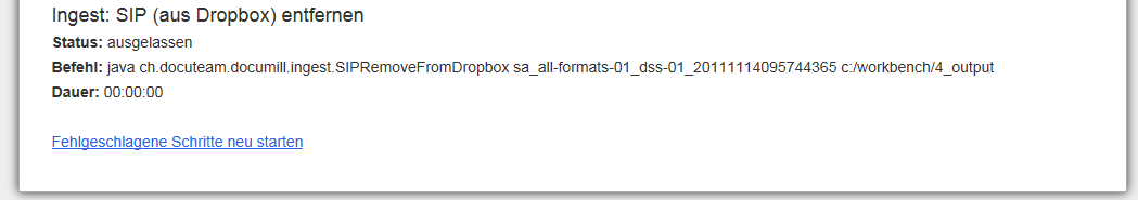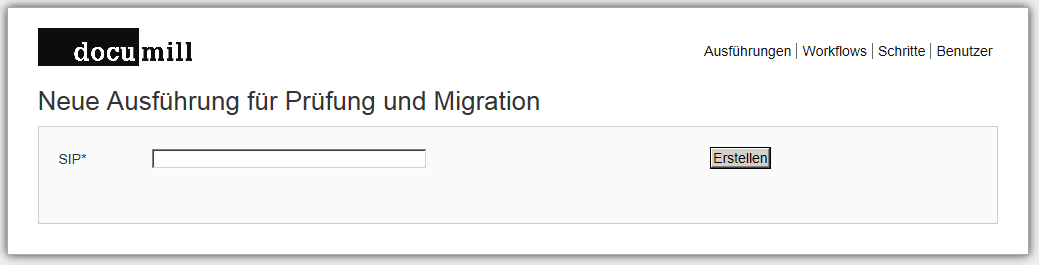 Im Normalbetrieb werden in einem Archiv die Ingest-Vorgänge nicht manuell ausgelöst, sondern automatisch. Sobald ein neues SIP in einem bestimmten vordefinierten Ordner eingetroffen ist, wird ein dazugehöriger Ingest-Workflow gestartet. Für den Testbetrieb kann der Ingest einzelner Ingests auch manuell ausgelöst werden. Zu diesem Zweck wird unter dem Menupunkt „Workflows“ bei einem Workflow der Befehl „starten“ aufgerufen. Im Formularfeld „SIP“ wird der Name des SIP angegeben. Wichtig: der Name muss ohne die Endung „.zip“ angegeben werden.