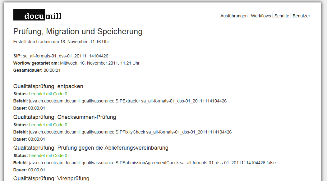 - Ausführungen: Hier wird zentral angezeigt, welche SIP durch den automatisierten Workflow bereits verarbeitet und ins digitale Archiv abgeliefert wurden, respektive welche Verarbeitung gerade im Gang ist. Es wird auch angezeigt, ob der Ingest-Workflow erfolgreich durchlaufen wurde oder ob Fehler aufgetreten sind, die manuelle Eingriffe nötig machen.