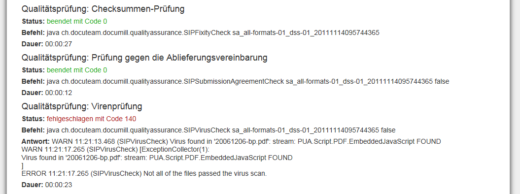 Der Ingest-Workflow wird dann gestartet und je nach eingestelltem Log-Level werden Informationen zu den einzelnen Workflowschritten angezeigt. Wenn ein Schritt erfolgreich beendet ist, dann wird ein grünes „beendet mit Code 0“ angezeigt und der nächste Schritt startet. Wenn ein Schritt fehlschlägt, dann wird dies in roter Schrift mit einem entsprechenden Fehlercode angezeigt. Im untenstehenden Beispiel wurde eine Datei mit Virus aufgefunden.