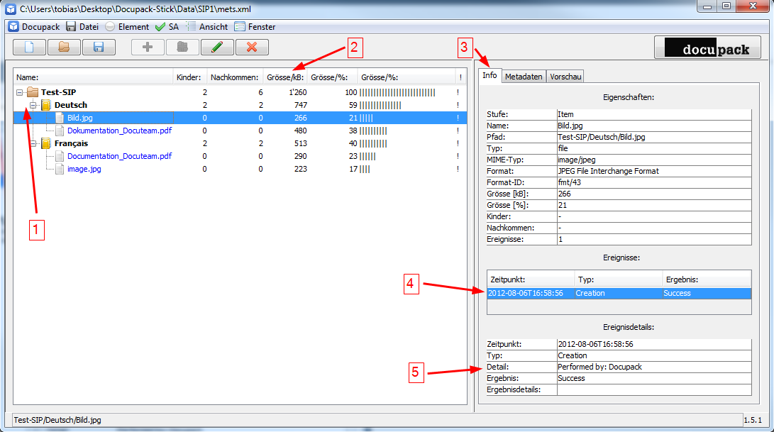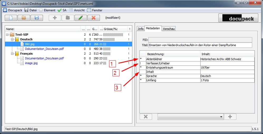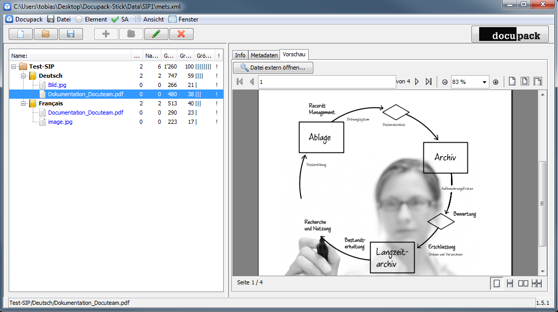 Docupack wird generell für die Visualisierung und Bearbeitung von Informationspaketen verwendet, welche auf dem METS-Standard basieren und dem Matterhorn-Profil entsprechen. Es kann sich sowohl um SIP, AIP als auch DIP handeln, für Docupack als Werkzeug spielt dies keine Rolle. In der folgenden Anleitung ist generell von „SIP“ die Rede, weil besonders die Bildung von Ablieferungen ans Archiv gezeigt werden soll.