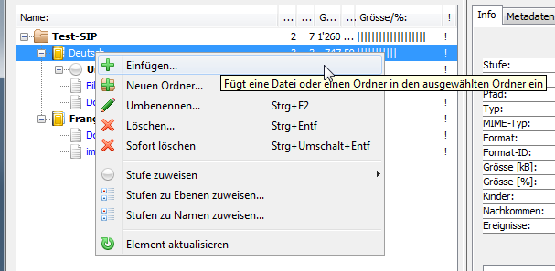 Mit Hilfe des Kontextmenus (rechte Maustaste) kann an einem bestimmten Punkt im SIP eine Datei oder ein Ordner eingefügt werden. Über das gleiche Menu können auch Dateien oder ganze Ordner gelöscht werden.