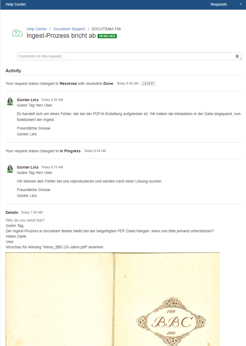 Wenn wir für den Issue eine Lösung finden, dann erhalten Sie eine entsprechende Mail und die Lösung wird im Ticketing-System dokumentiert. Sie können auch später noch auf die Tickets zugreifen, so bauen Sie sich eine Wissensdatenbank auf.