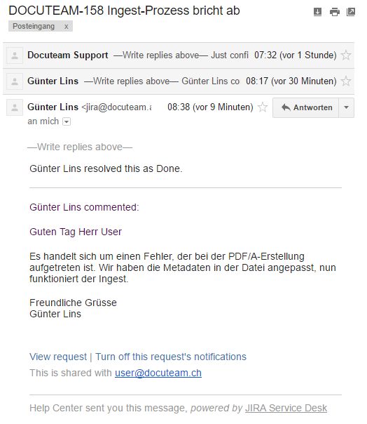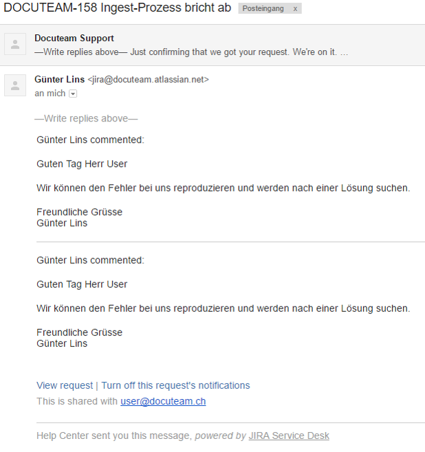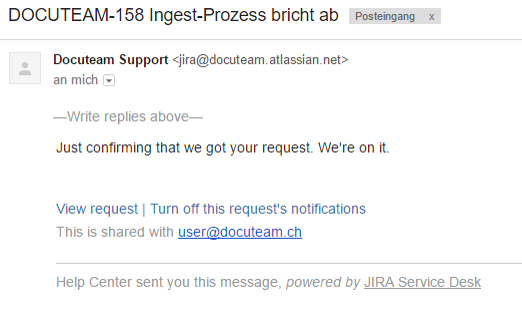 Das Ticketing-System sendet Ihnen eine automatisierte Antwort mit einem Standardtext. Sie kennen nun die Ticket-Nummer (im vorliegenden Fall DOCUTEAM-158)