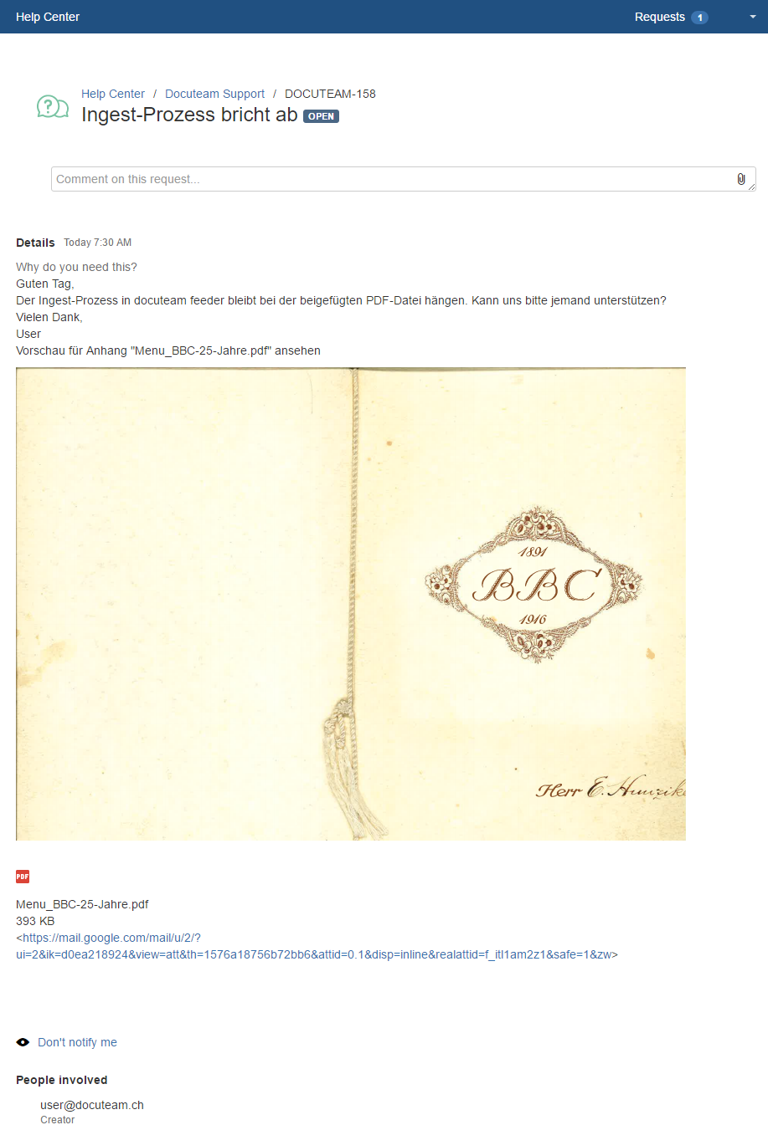 1. Kontaktaufnahme per Mail an support@docuteam.ch