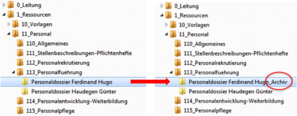 Die Mitarbeitenden können ein Dossier als abgeschlossen markieren, indem sie die Beschriftung des zu archivierenden Ordners mit dem Zusatz «_Archiv» ergänzen (vgl. untenstehende Abbildung).