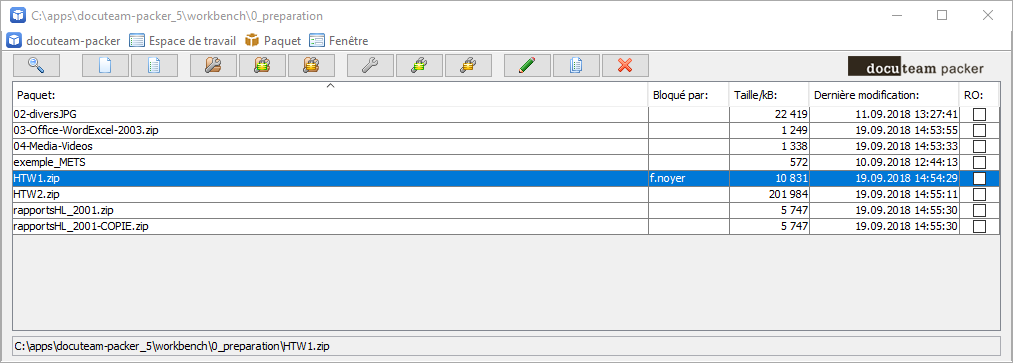 Par „Workspace“, autrement dit espace de travail, on désigner le répertoire du système d'exploitation, où se passe le traitement des SIP. La variable qui définit le chemin du Workspace est contenue dans le fichier de configuration docuteamPacker.properties, lequel se trouve dans le répertoire „config“ de la distribution décompressée. Tout nouveau paquet créé ou tout paquet modifié est sauvegardé par défaut dans ce répertoire. Haut de page